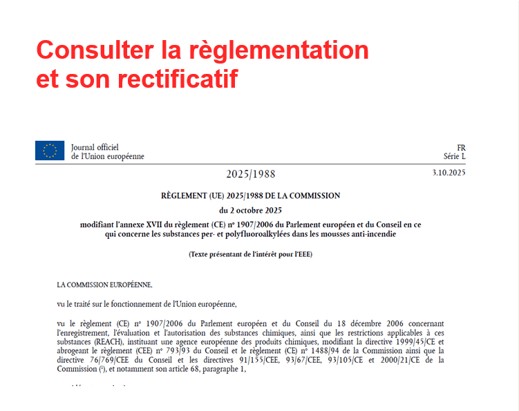 Le Journal officiel de l’Union européenne a publié le Règlement (UE) 2025/1988 du 2 octobre 2025, complété par son rectificatif n° 2025/90800, relatif à l’utilisation des PFAS dans les mousses anti-incendie.